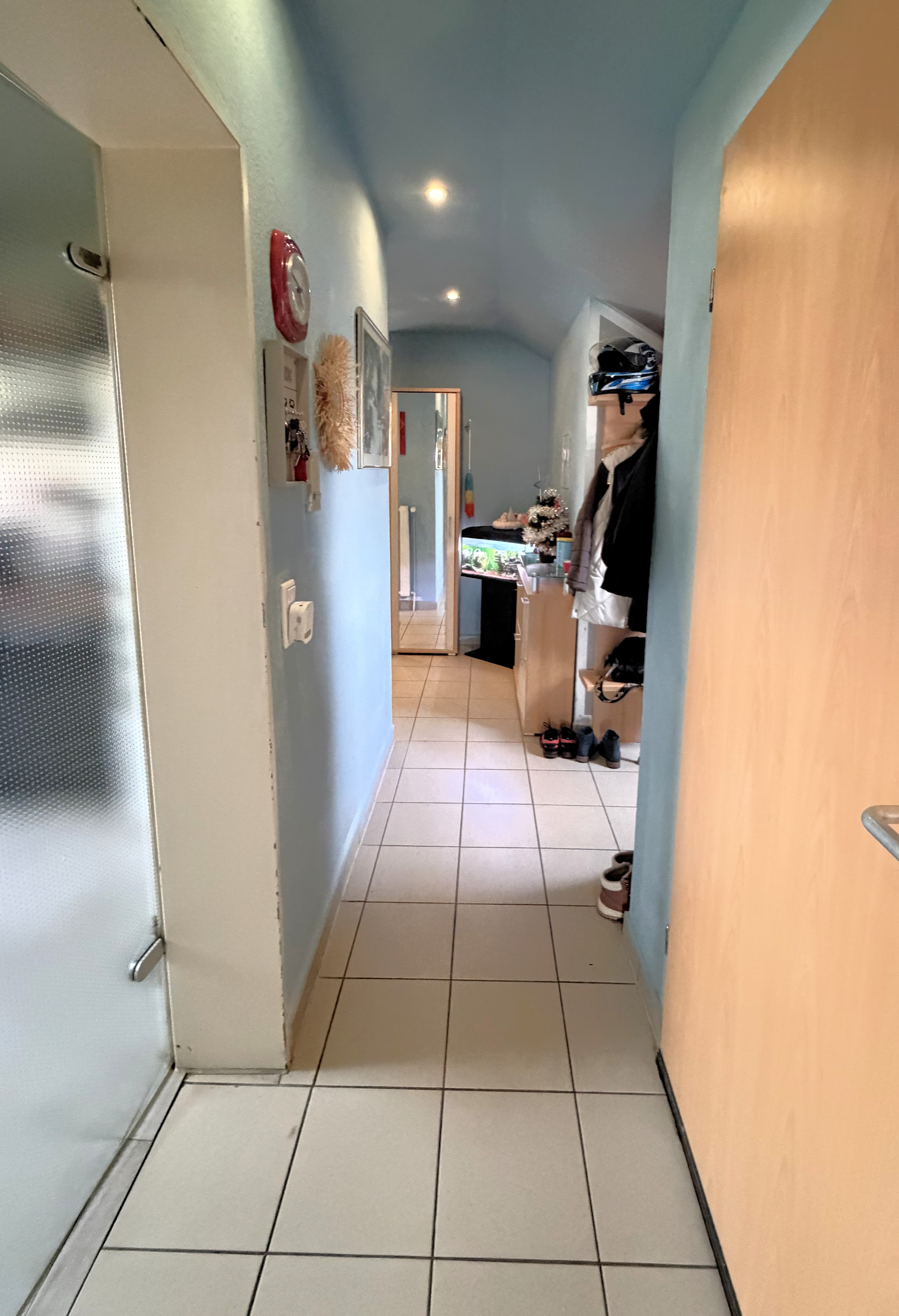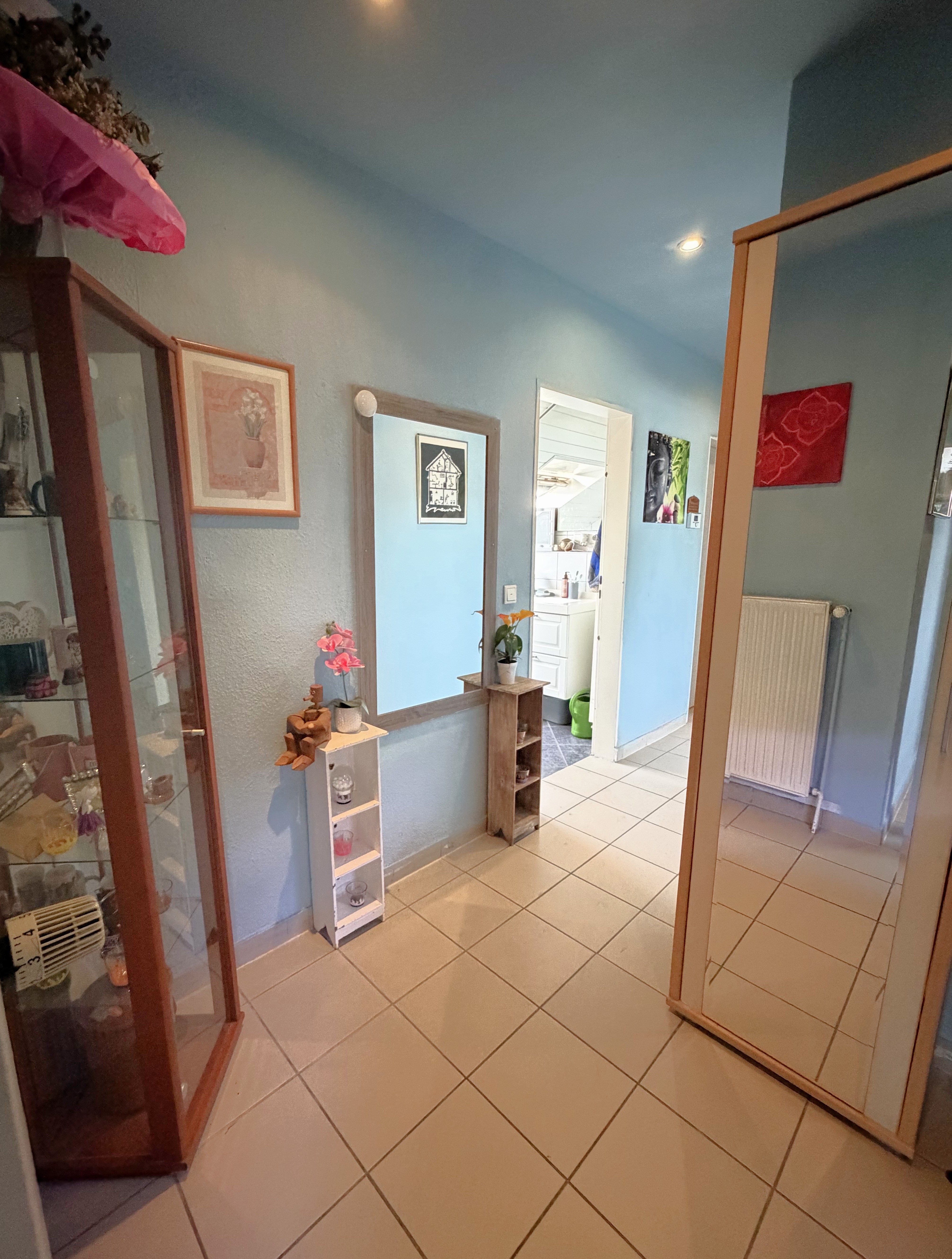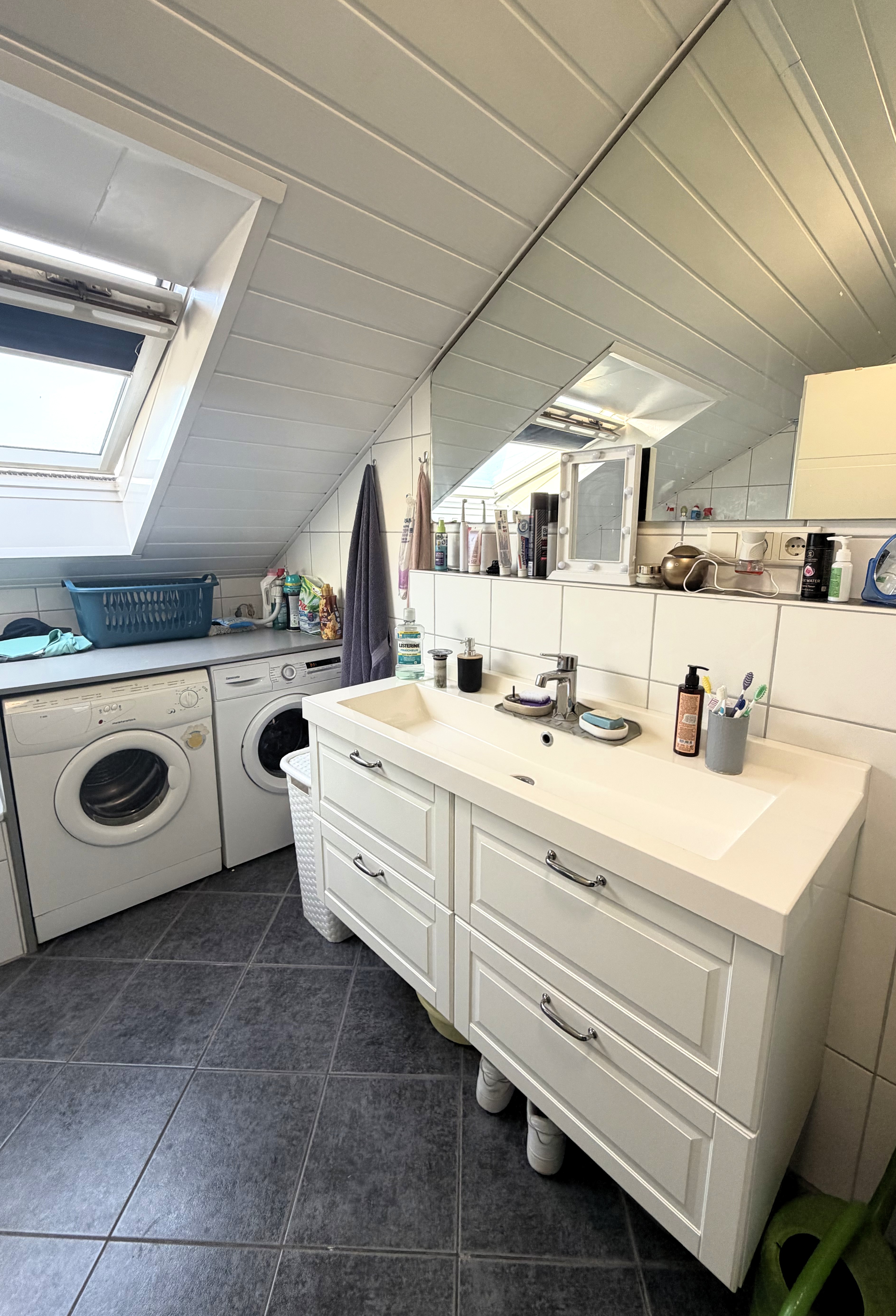 Das Badezimmer ist mit einer Badewanne, einer Dusche und einem Fenster ausgestattet. Die meisten Räume sind gefliest, lediglich in den Schlafzimmern ist ein anderer Bodenbelag vorhanden.