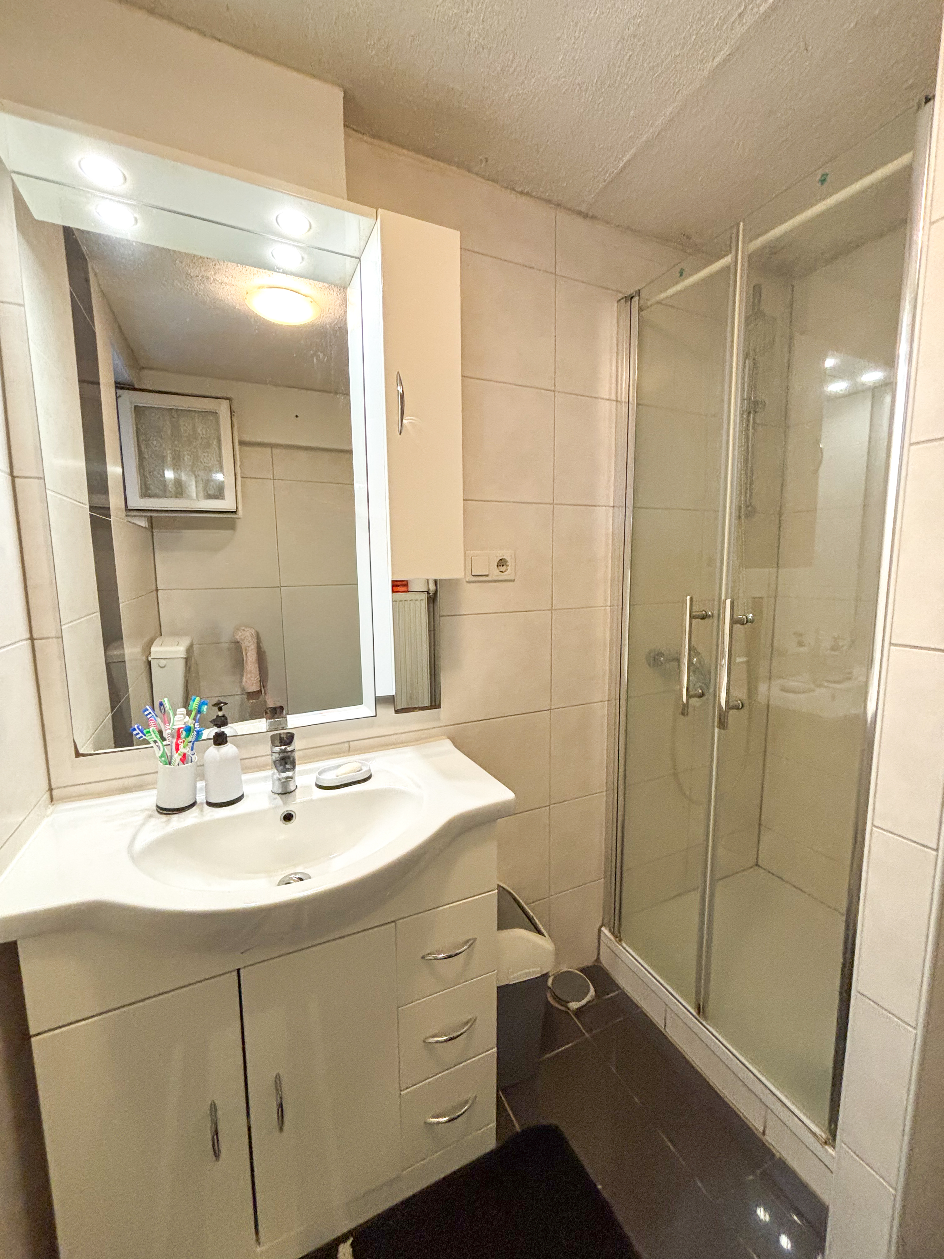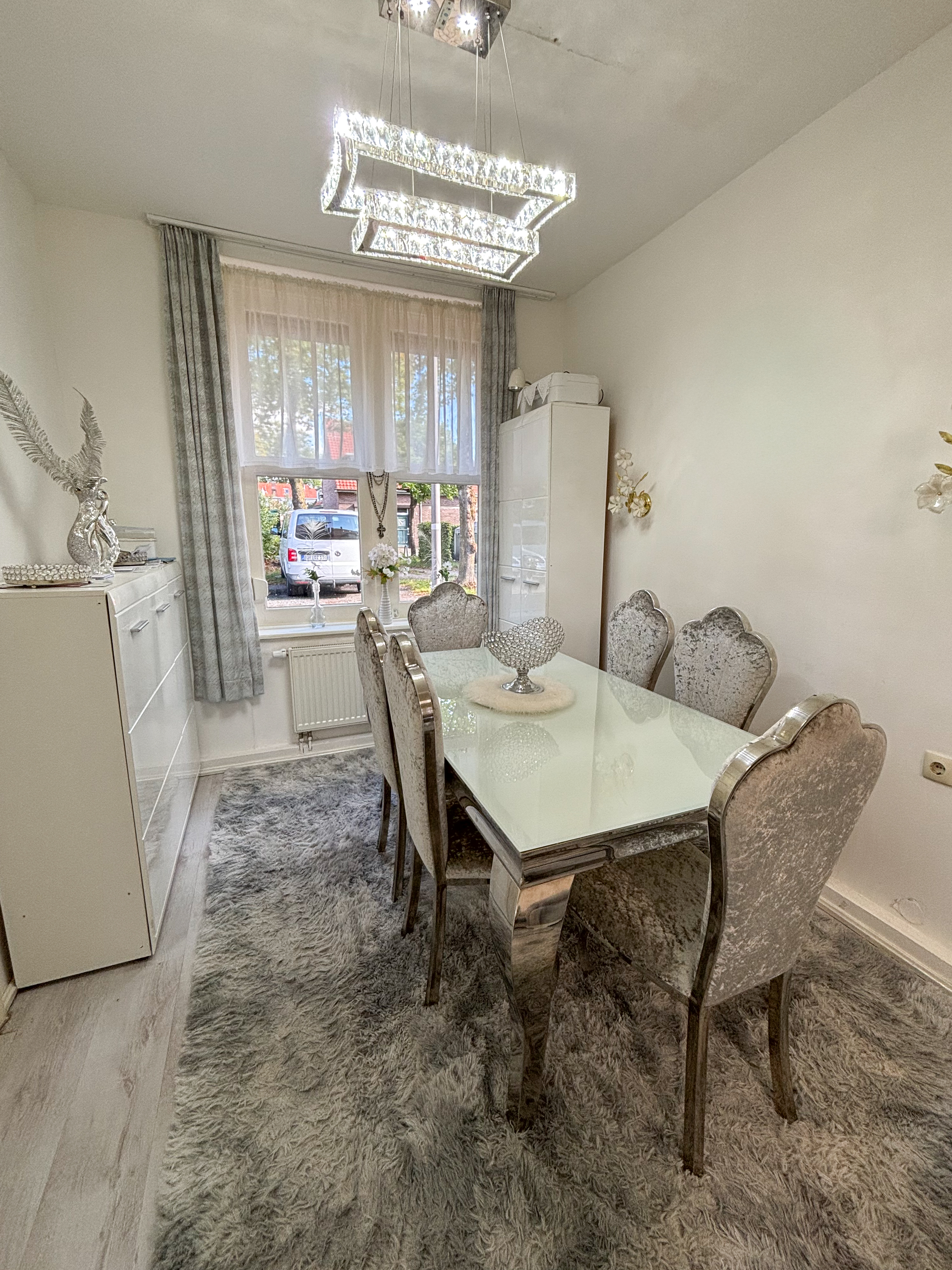 Im Erdgeschoss bildet ein zentraler Flur den Ausgangspunkt und verbindet alle Räume miteinander. Das helle Wohnzimmer lädt zum Verweilen ein und grenzt direkt an die separate Küche, während ein angrenzender Essbereich zusätzlichen Raum für gemeinsame Mahlzeiten bietet. Die Küche ist funktional geschnitten und bietet ausreichend Platz für gemeinsame Mahlzeiten. Das Badezimmer mit Fenster und Dusche befindet sich ebenfalls im Erdgeschoss und verfügt über eine angenehme Größe.